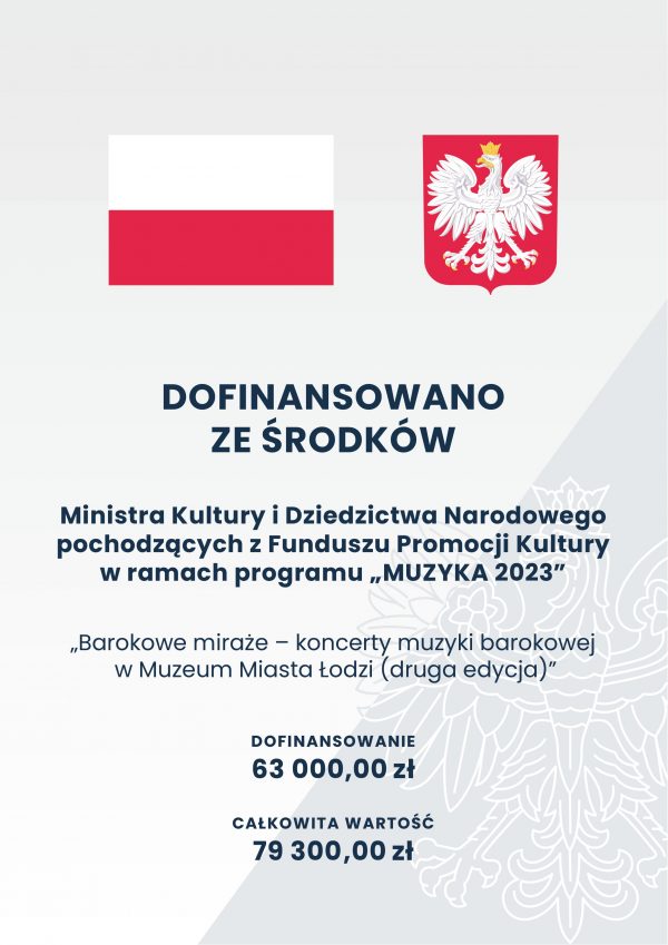 Projekt „Barokowe miraże – koncerty muzyki barokowej w Muzeum Miasta Łodzi” dofinansowano ze środków Ministra Kultury i Dziedzictwa Narodowego pochodzących z Funduszu Promocji Kultury – państwowego funduszu celowego, w ramach programu „Muzyka 2023”, realizowanego przez Narodowy Instytut Muzyki i Tańca.