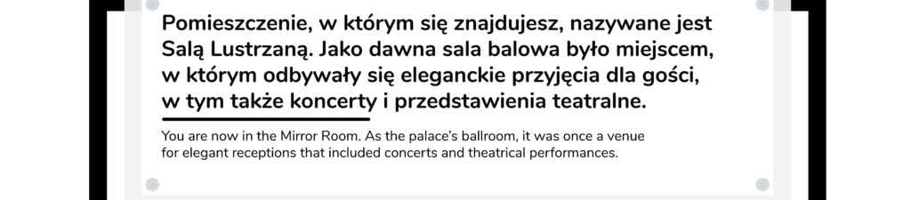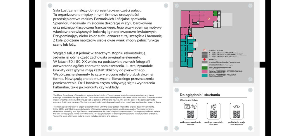 W środkowej części tablicy jest bardziej dokładny opis danego pomieszczenia, plan pałacu, na którym zaznaczona jest miejsce, gdzie się znajdujesz, oraz kody QR, za pomocą których możesz odsłuchać audiodeskrypcje i nagrania audioprzewodnika oraz obejrzeć materiały wideo.