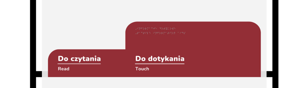 W kieszeniach wbudowanych w tablice informacyjne znajdują się: tyflografiki wybranych eksponatów, karty z opisami pomieszczeń zapisanymi w druku powiększonym i alfabecie Braille’a.