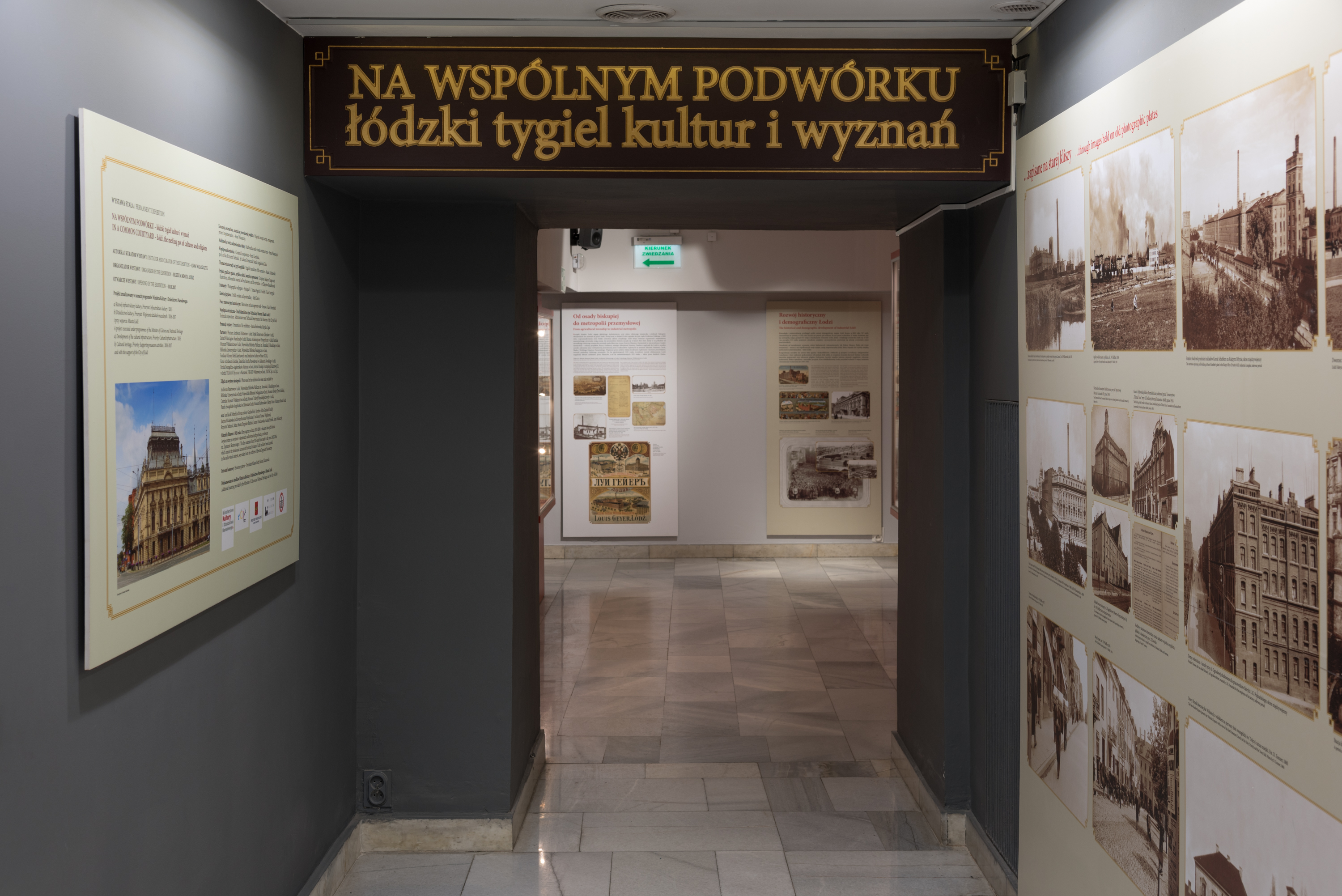 Na ścianach obejrzeć można zdjęcia potomków Izraela Poznańskiego oraz dużą planszę z rozbudowanym drzewem genealogicznym jego rodziny. Dzięki niej można prześledzić jej dzieje już od protoplasty rodu — Kalmana Poznańskiego, aż po jego najmłodszych, współcześnie żyjących potomków. Na ścianie naprzeciwko znajdują się z kolei fotokopie archiwalnych dokumentów prezentujących rozwój bawełnianego imperium. Jedna z nich przedstawia teren dawnego rewiru żydowskiego na Starym Mieście, gdzie stał dom, do którego Poznańscy wprowadzili się po przyjeździe do Łodzi w 1834 r. Tuż obok niego znajdował się należący do rodziny sklep z wyrobami bawełnianymi, lnianymi oraz artykułami korzennymi. W połowie XIX wieku zaczął nim zarządzać Izrael Poznański, który dzięki nowoczesnemu wykształceniu oraz dobrze skojarzonemu małżeństwu z posażną Leonią Hertz zaczął go przekształcać w nowoczesne przedsiębiorstwo. Kolejne fotografie prezentują jego rozwój oraz skalę przestrzeni zajmowanej przez kompleks fabryczno–rezydencjonalny. Izrael Poznański czynnie angażował się również w życie społeczne Łodzi i działalność charytatywną, o czym świadczą zdjęcia prezentujące wybrane budynki fundowane przez fabrykanta.